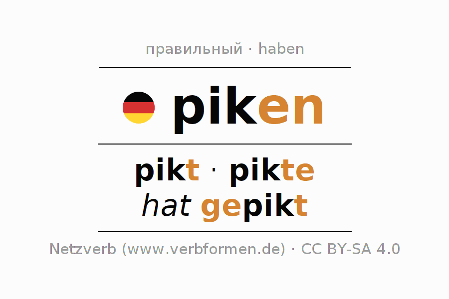 Формами спряжения piken (колоть, укол) в повелительном наклонении являются: pike (du), piken wir, pikt (ihr), piken Sie