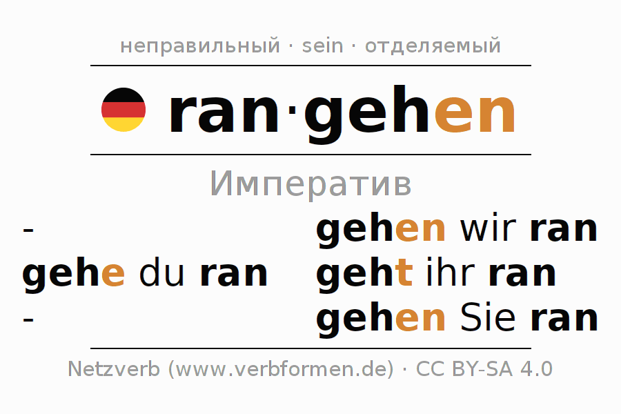 Формами спряжения rangehen (браться, взяться) в повелительном наклонении являются: gehe (du) ran, gehen wir ran, geht (ihr) ran, gehen Sie ran