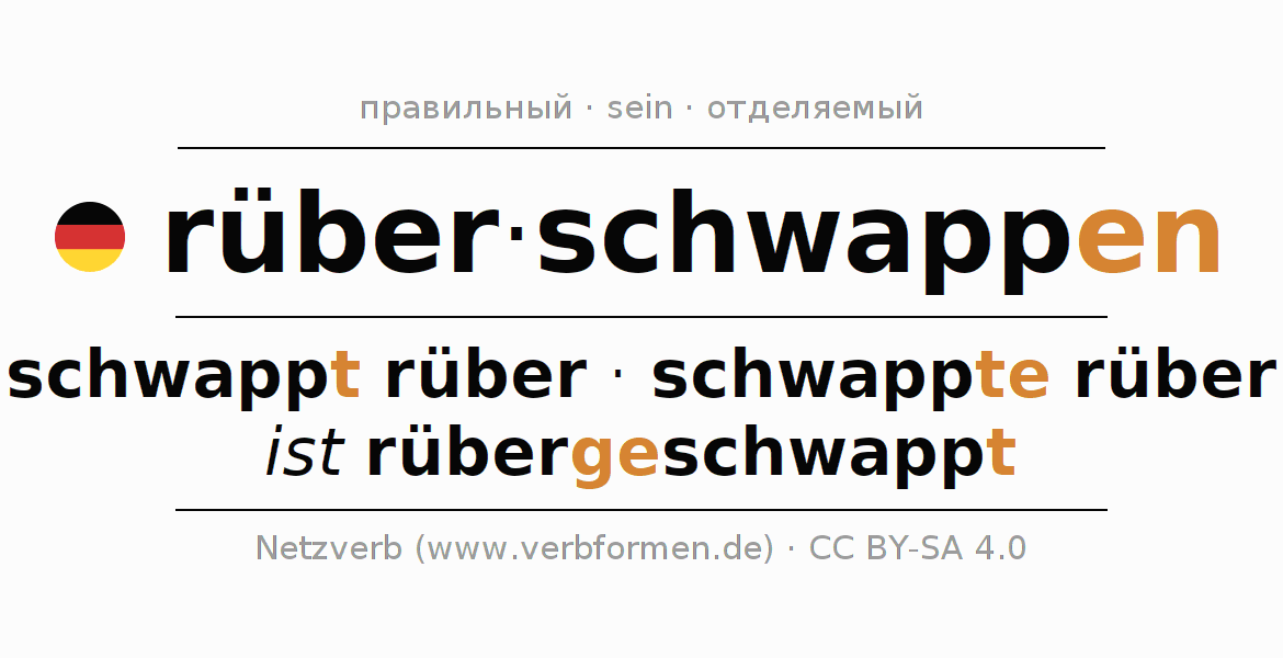 Формами спряжения rüberschwappen (переплывать, перетекать) в повелительном наклонении являются: schwappe (du) rüber, schwappen wir rüber, schwappt (ihr) rüber, schwappen Sie rüber