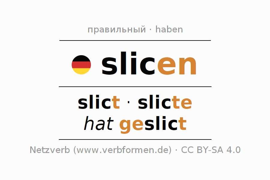 Формами спряжения slicen (резать, срезать) в повелительном наклонении являются: slice (du), slicen wir, slict (ihr), slicen Sie