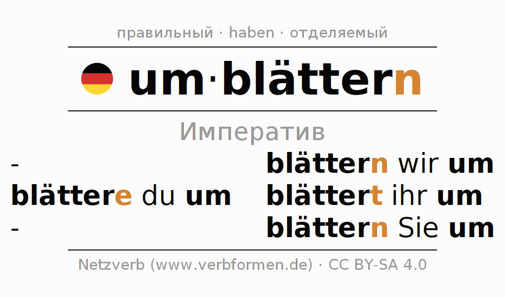 Формами спряжения umblättern (перелистывать, листать) в повелительном наклонении являются: blätt(e)re (du) um, blättern wir um, blättert (ihr) um, blättern Sie um