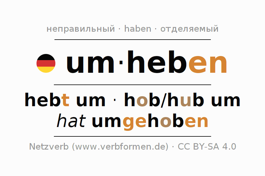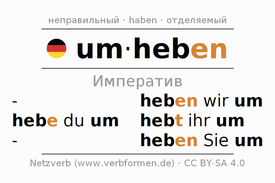 Формами спряжения umheben (вмешивать, подмешивать) в повелительном наклонении являются: hebe (du) um, heben wir um, hebt (ihr) um, heben Sie um