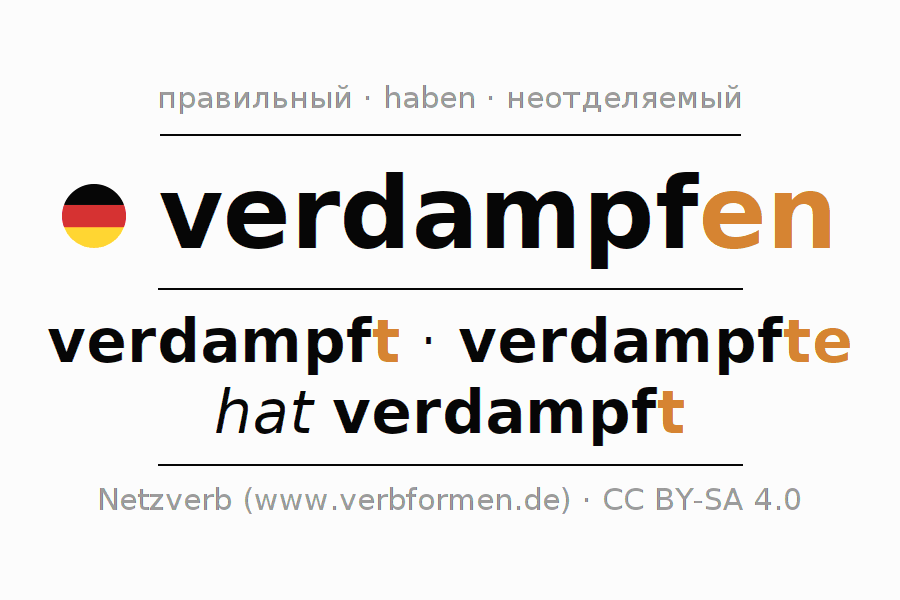 Формами спряжения verdampfen (испаряться, испариться) в повелительном наклонении являются: verdampfe (du), verdampfen wir, verdampft (ihr), verdampfen Sie