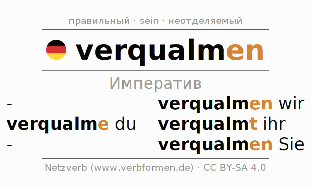 Формами спряжения verqualmen (растворяться в дыму) в повелительном наклонении являются: verqualme (du), verqualmen wir, verqualmt (ihr), verqualmen Sie