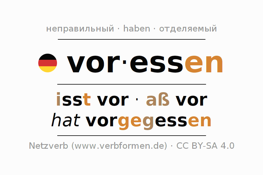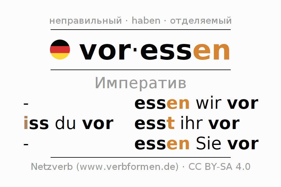 Формами спряжения voressen (съедать) в повелительном наклонении являются: iss (du) vor, essen wir vor, esst (ihr) vor, essen Sie vor