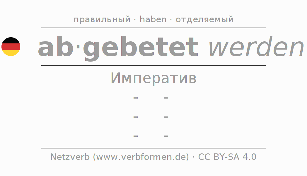 Спряжение abbeten в Императив Презенс Повелительное наклонение Пассив с werden: -, -, -, -.Образование этих форм происходит по определённым грамматическим правилам. Так же спрягаются простые глагольные формы abbeten в Императив. Kомментарии ☆