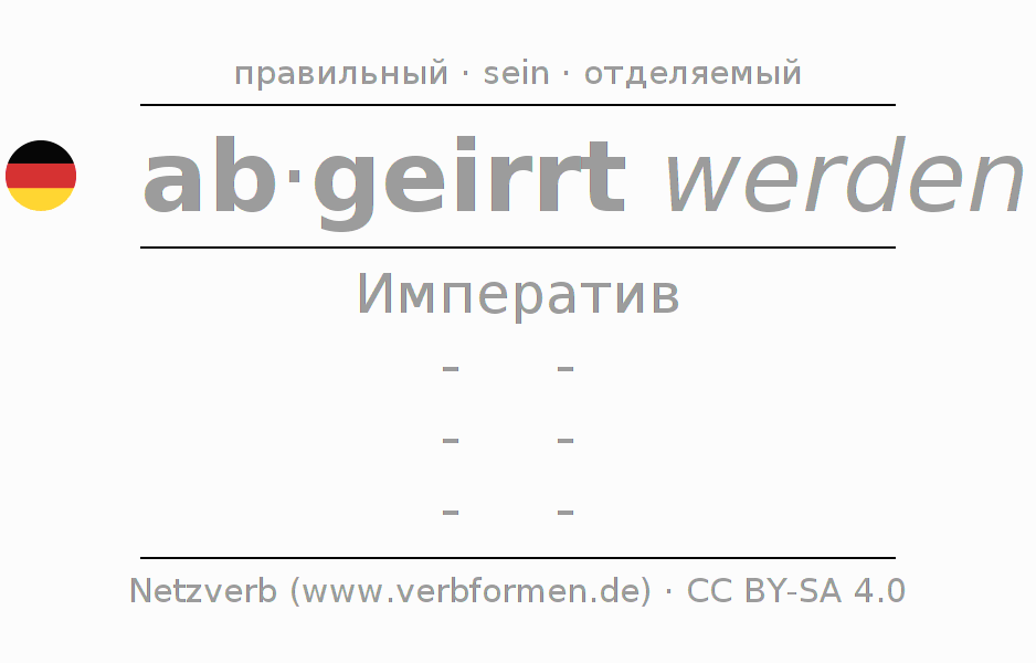 Спряжение abirren в Императив Презенс Повелительное наклонение Пассив с werden: -, -, -, -.Образование этих форм происходит по определённым грамматическим правилам. Так же спрягаются простые глагольные формы abirren в Императив. Kомментарии ☆