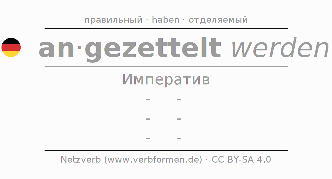 Спряжение anzetteln в Императив Презенс Повелительное наклонение Пассив с werden: -, -, -, -.Образование этих форм происходит по определённым грамматическим правилам. Так же спрягаются простые глагольные формы anzetteln в Императив. Kомментарии ☆