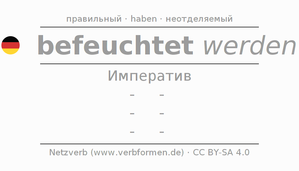 Спряжение befeuchten в Императив Презенс Повелительное наклонение Пассив с werden: -, -, -, -.Образование этих форм происходит по определённым грамматическим правилам. Так же спрягаются простые глагольные формы befeuchten в Императив. Kомментарии ☆