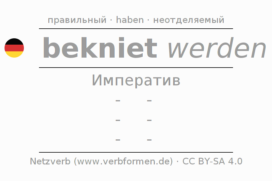 Спряжение beknien в Императив Презенс Повелительное наклонение Пассив с werden: -, -, -, -.Образование этих форм происходит по определённым грамматическим правилам. Так же спрягаются простые глагольные формы beknien в Императив. Kомментарии ☆