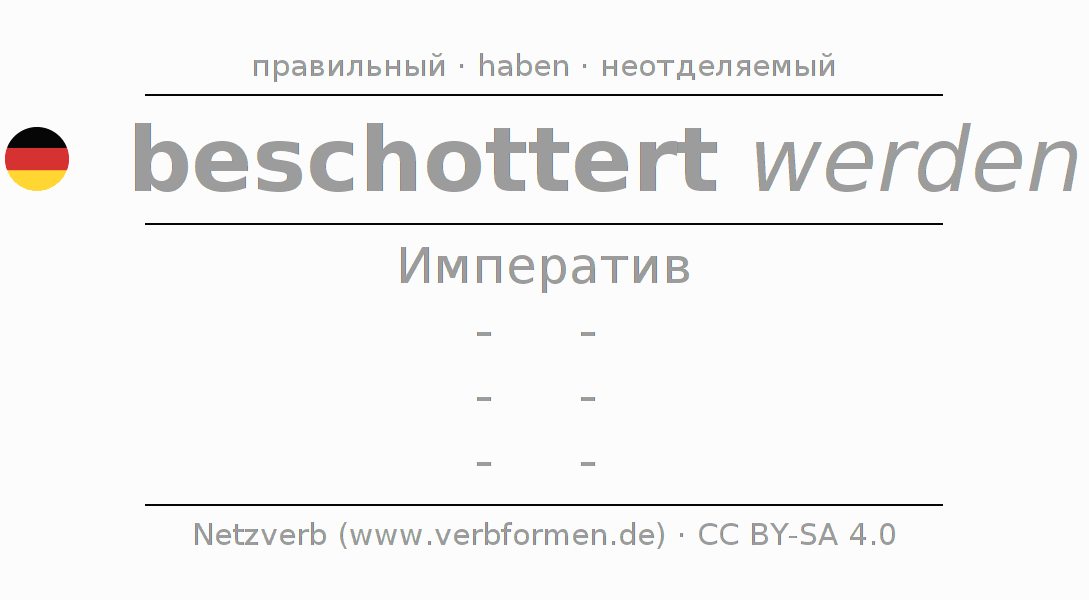 Спряжение beschottern в Императив Презенс Повелительное наклонение Пассив с werden: -, -, -, -.Образование этих форм происходит по определённым грамматическим правилам. Так же спрягаются простые глагольные формы beschottern в Императив. Kомментарии ☆