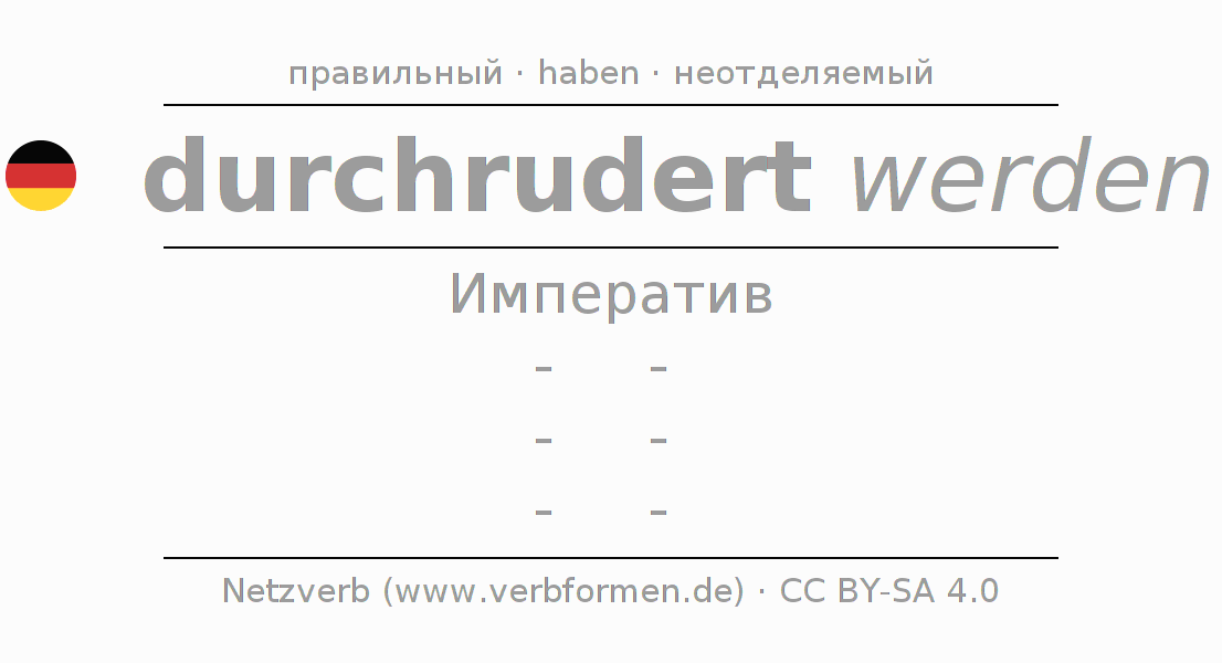 Спряжение durchrudern в Императив Презенс Повелительное наклонение Пассив с werden: -, -, -, -.Образование этих форм происходит по определённым грамматическим правилам. Так же спрягаются простые глагольные формы durchrudern в Императив. Kомментарии ☆