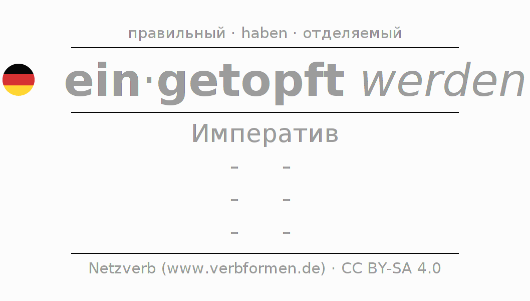 Спряжение eintopfen в Императив Презенс Повелительное наклонение Пассив с werden: -, -, -, -.Образование этих форм происходит по определённым грамматическим правилам. Так же спрягаются простые глагольные формы eintopfen в Императив. Kомментарии ☆