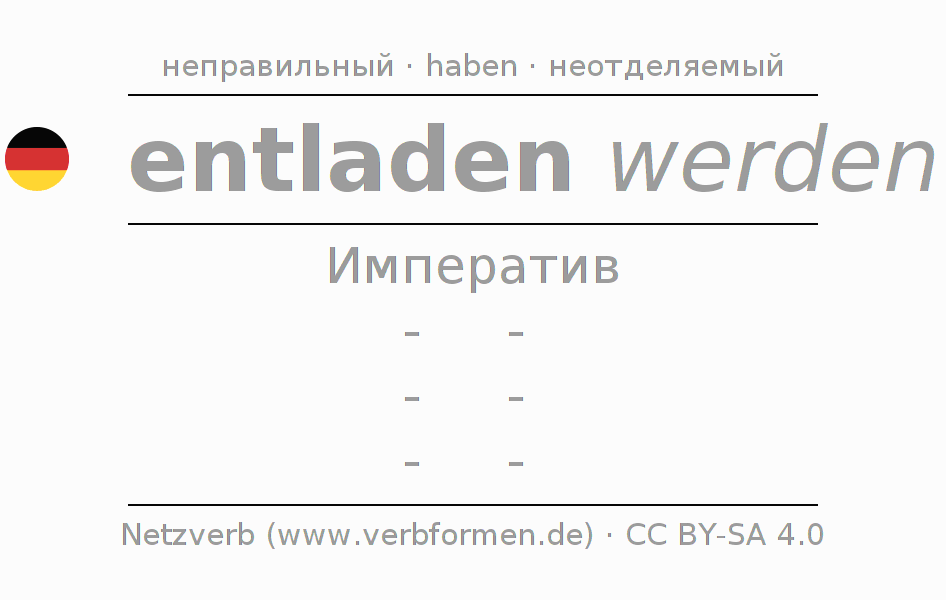 Спряжение entladen в Императив Презенс Повелительное наклонение Пассив с werden: -, -, -, -.Образование этих форм происходит по определённым грамматическим правилам. Так же спрягаются простые глагольные формы entladen в Императив. Kомментарии ☆