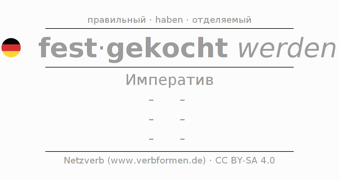 Спряжение festkochen в Императив Презенс Повелительное наклонение Пассив с werden: -, -, -, -.Образование этих форм происходит по определённым грамматическим правилам. Так же спрягаются простые глагольные формы festkochen в Императив. Kомментарии ☆