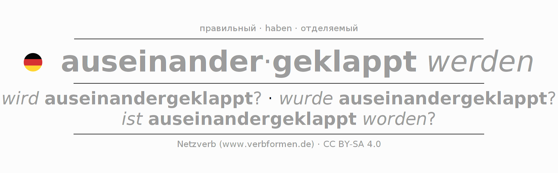 Спряжение auseinanderklappen в Императив Презенс Повелительное наклонение Пассив с werden: -, -, -, -.Образование этих форм происходит по определённым грамматическим правилам. Так же спрягаются простые глагольные формы auseinanderklappen в Императив. Kомментарии ☆