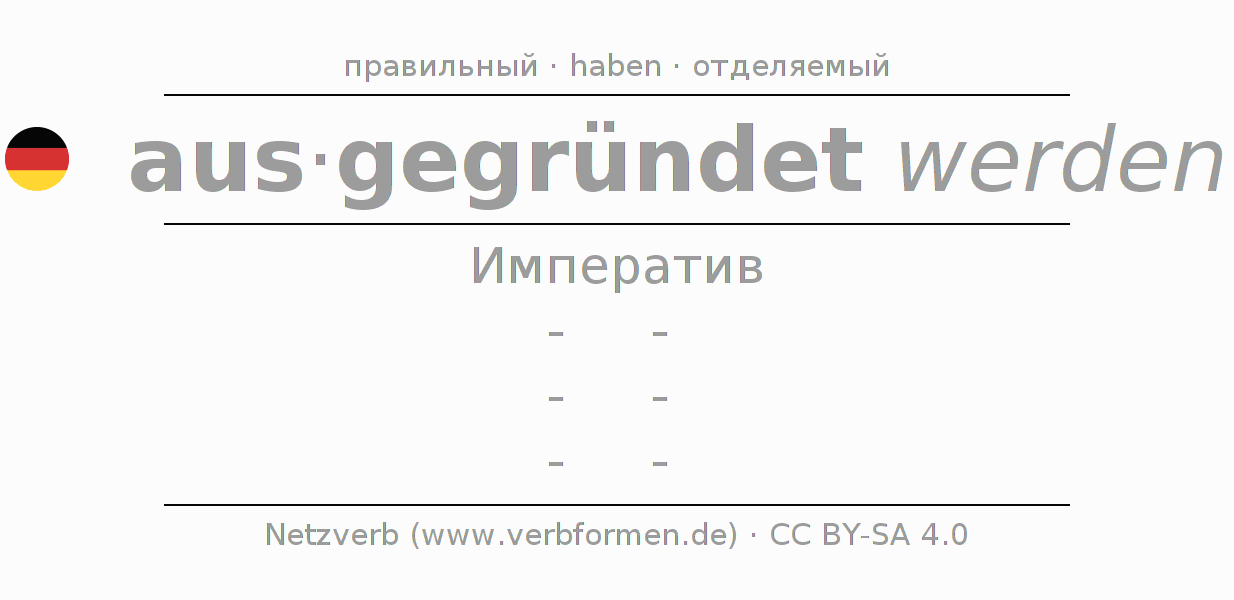 Спряжение ausgründen в Императив Презенс Повелительное наклонение Пассив с werden: -, -, -, -.Образование этих форм происходит по определённым грамматическим правилам. Так же спрягаются простые глагольные формы ausgründen в Императив. Kомментарии ☆