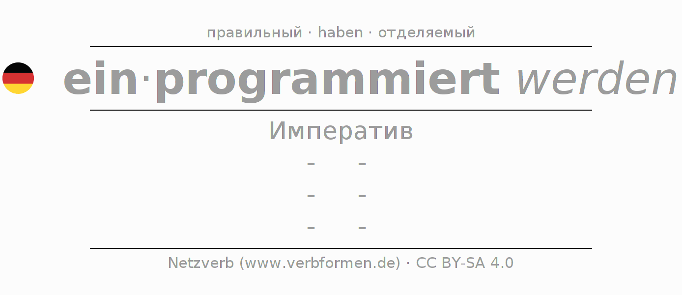 Спряжение einprogrammieren в Императив Презенс Повелительное наклонение Пассив с werden: -, -, -, -.Образование этих форм происходит по определённым грамматическим правилам. Так же спрягаются простые глагольные формы einprogrammieren в Императив. Kомментарии ☆