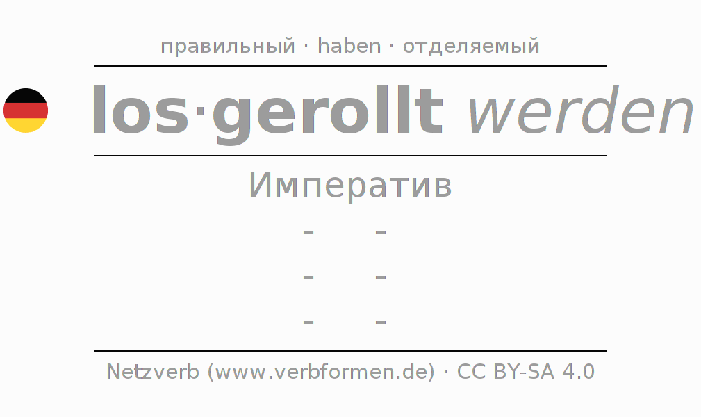 Спряжение losrollen в Императив Презенс Повелительное наклонение Пассив с werden: -, -, -, -.Образование этих форм происходит по определённым грамматическим правилам. Так же спрягаются простые глагольные формы losrollen в Императив. Kомментарии ☆