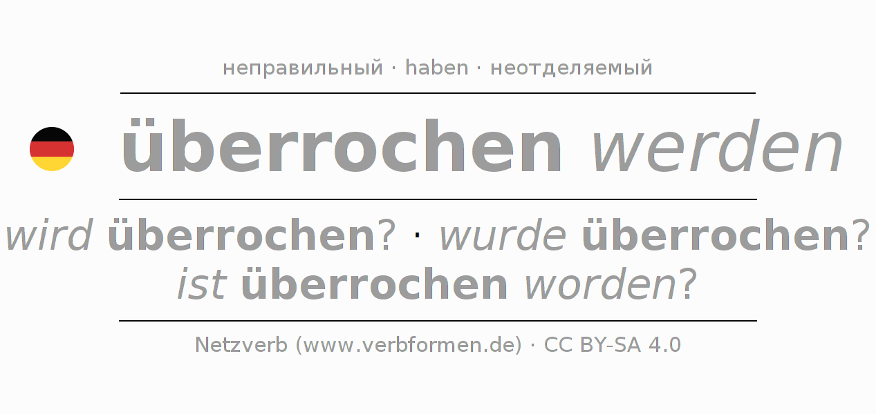 Спряжение überriechen в Императив Презенс Повелительное наклонение Пассив с werden: -, -, -, -.Образование этих форм происходит по определённым грамматическим правилам. Так же спрягаются простые глагольные формы überriechen в Императив. Kомментарии ☆
