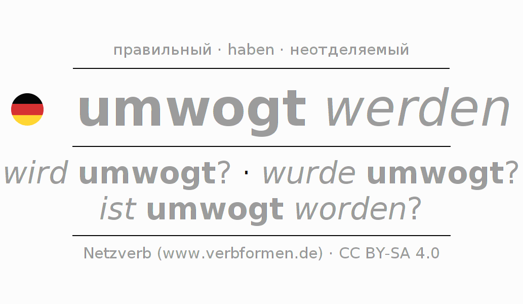 Спряжение umwogen в Императив Презенс Повелительное наклонение Пассив с werden: -, -, -, -.Образование этих форм происходит по определённым грамматическим правилам. Так же спрягаются простые глагольные формы umwogen в Императив. Kомментарии ☆