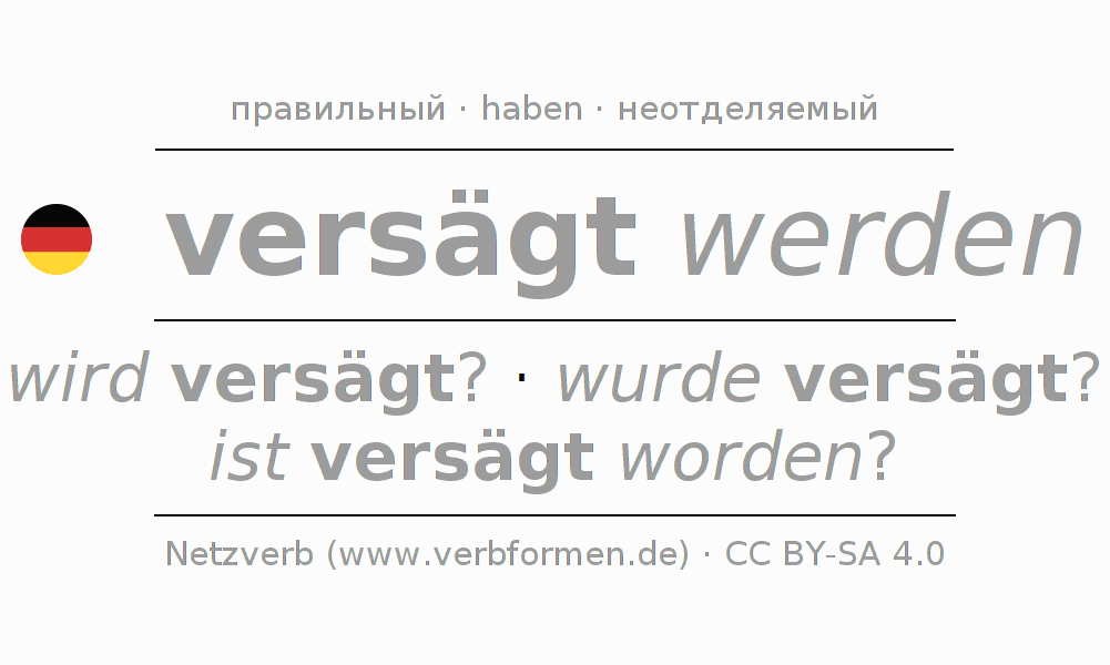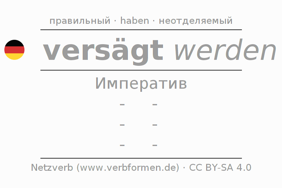Спряжение versägen в Императив Презенс Повелительное наклонение Пассив с werden: -, -, -, -.Образование этих форм происходит по определённым грамматическим правилам. Так же спрягаются простые глагольные формы versägen в Императив. Kомментарии ☆