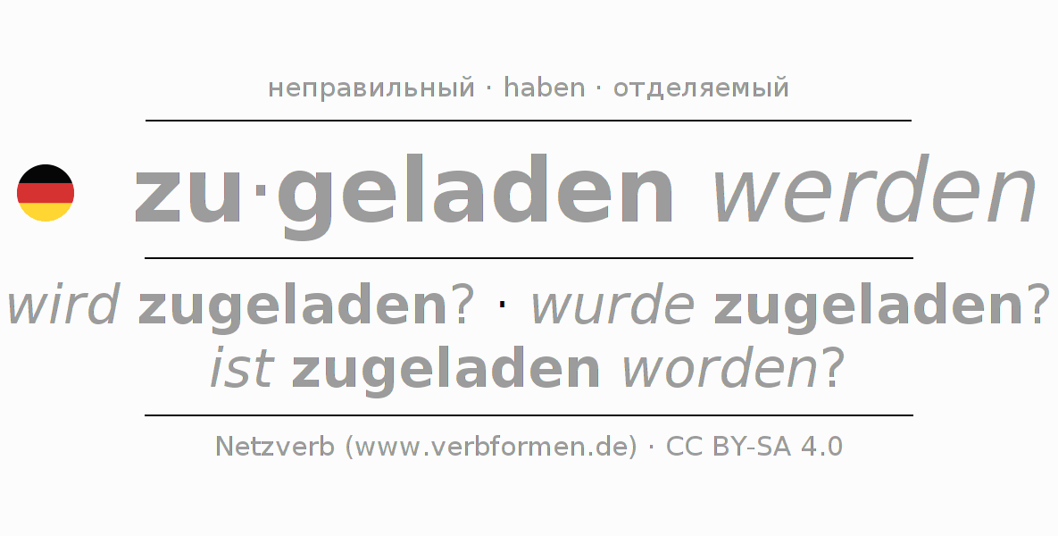 Спряжение zuladen в Императив Презенс Повелительное наклонение Пассив с werden: -, -, -, -.Образование этих форм происходит по определённым грамматическим правилам. Так же спрягаются простые глагольные формы zuladen в Императив. Kомментарии ☆
