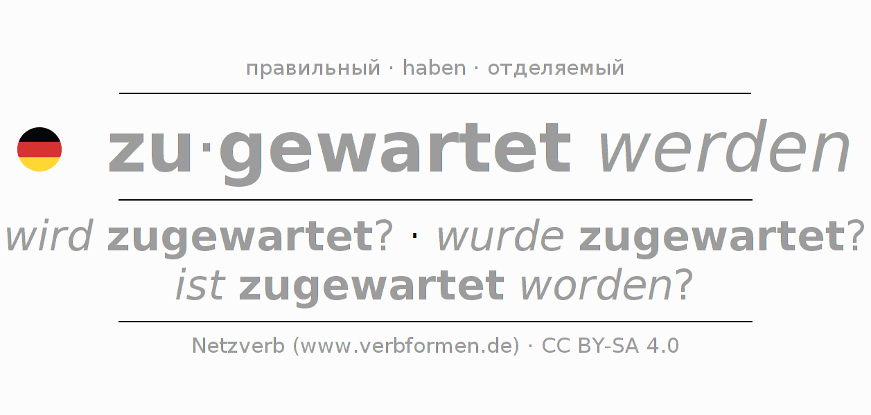 Спряжение zuwarten в Императив Презенс Повелительное наклонение Пассив с werden: -, -, -, -.Образование этих форм происходит по определённым грамматическим правилам. Так же спрягаются простые глагольные формы zuwarten в Императив. Kомментарии ☆