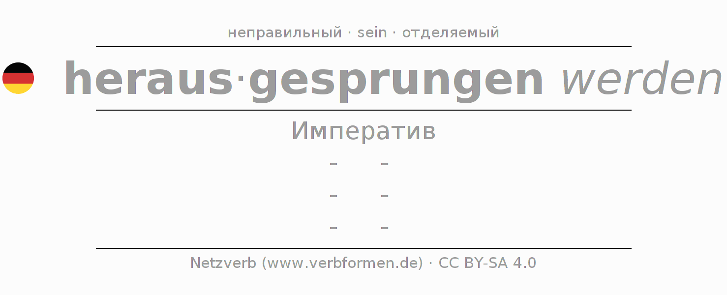 Спряжение herausspringen в Императив Презенс Повелительное наклонение Пассив с werden: -, -, -, -.Образование этих форм происходит по определённым грамматическим правилам. Так же спрягаются простые глагольные формы herausspringen в Императив. Kомментарии ☆