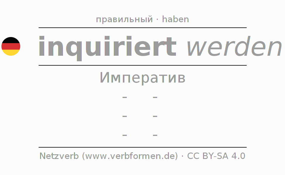 Спряжение inquirieren в Императив Презенс Повелительное наклонение Пассив с werden: -, -, -, -.Образование этих форм происходит по определённым грамматическим правилам. Так же спрягаются простые глагольные формы inquirieren в Императив. Kомментарии ☆