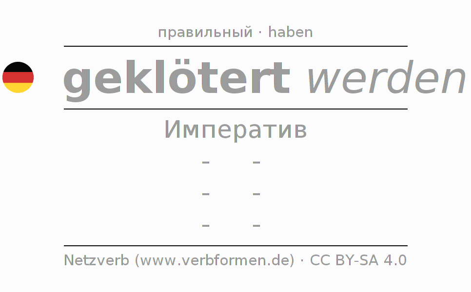 Спряжение klötern в Императив Презенс Повелительное наклонение Пассив с werden: -, -, -, -.Образование этих форм происходит по определённым грамматическим правилам. Так же спрягаются простые глагольные формы klötern в Императив. Kомментарии ☆
