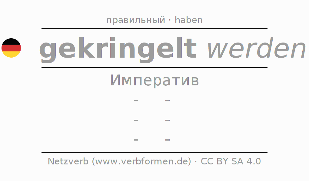 Спряжение kringeln в Императив Презенс Повелительное наклонение Пассив с werden: -, -, -, -.Образование этих форм происходит по определённым грамматическим правилам. Так же спрягаются простые глагольные формы kringeln в Императив. Kомментарии ☆