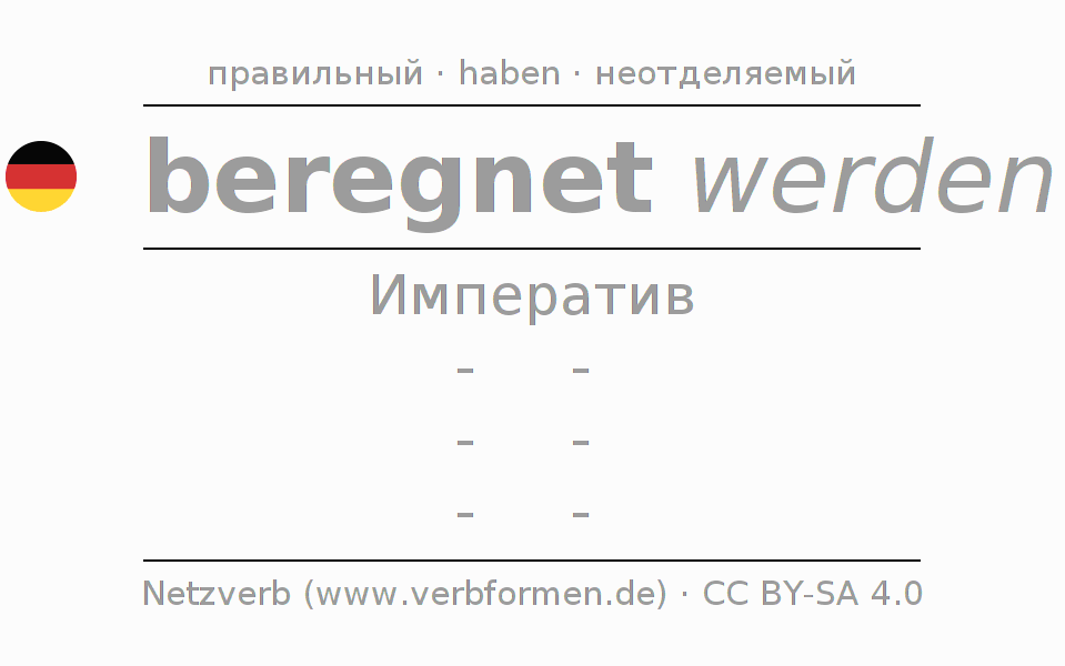 Спряжение beregnen в Императив Презенс Повелительное наклонение Пассив с werden: -, -, -, -.Образование этих форм происходит по определённым грамматическим правилам. Так же спрягаются простые глагольные формы beregnen в Императив. Kомментарии ☆