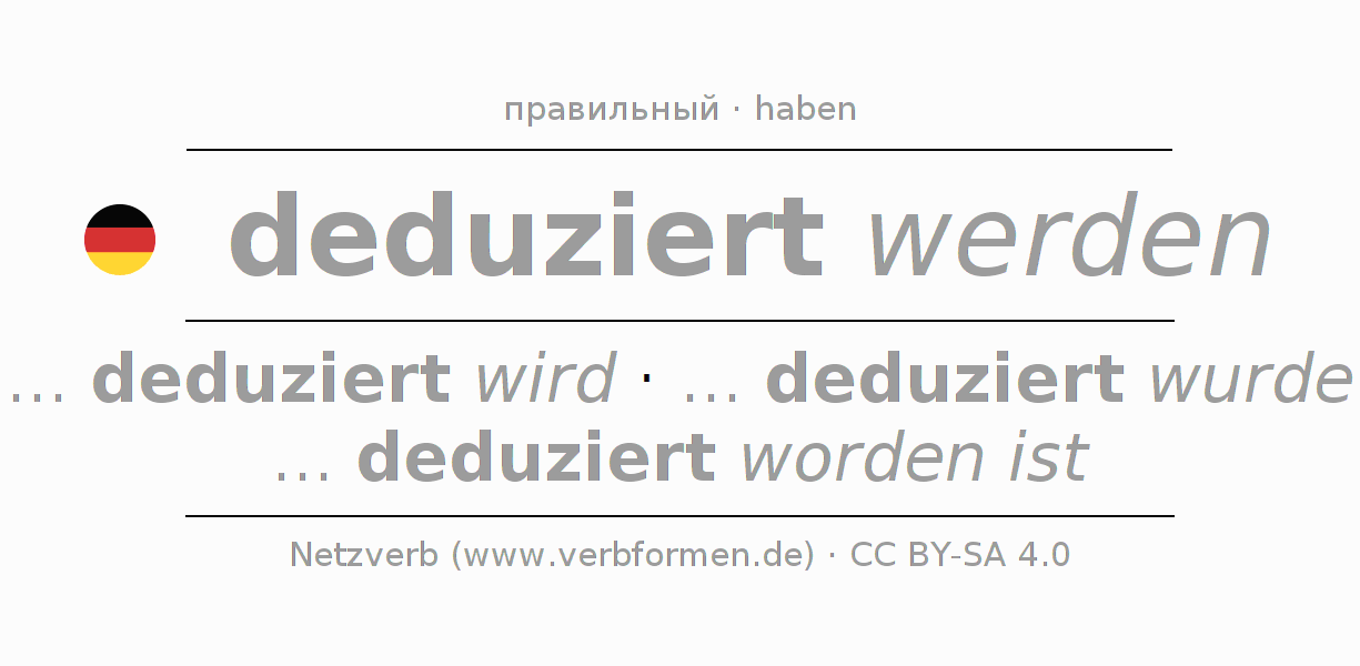 Спряжение deduzieren в Императив Презенс Повелительное наклонение Пассив с werden: -, -, -, -.Образование этих форм происходит по определённым грамматическим правилам. Так же спрягаются простые глагольные формы deduzieren в Императив. Kомментарии ☆