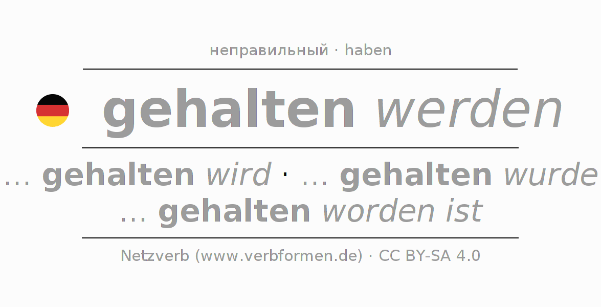 Спряжение halten в Императив Презенс Повелительное наклонение Пассив с werden: -, -, -, -.Образование этих форм происходит по определённым грамматическим правилам. Так же спрягаются простые глагольные формы halten в Императив. 2Комментарии ☆5.0