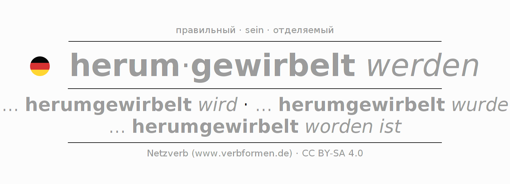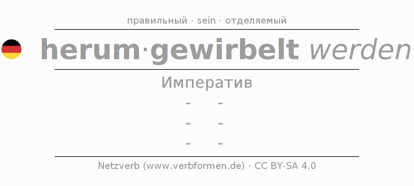 Спряжение herumwirbeln в Императив Презенс Повелительное наклонение Пассив с werden: -, -, -, -.Образование этих форм происходит по определённым грамматическим правилам. Так же спрягаются простые глагольные формы herumwirbeln в Императив. Kомментарии ☆