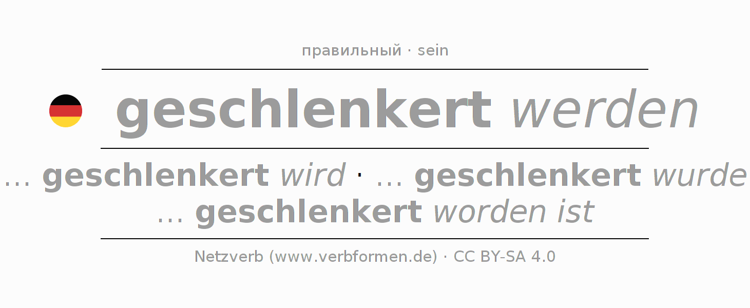 Спряжение schlenkern в Императив Презенс Повелительное наклонение Пассив с werden: -, -, -, -.Образование этих форм происходит по определённым грамматическим правилам. Так же спрягаются простые глагольные формы schlenkern в Императив. Kомментарии ☆