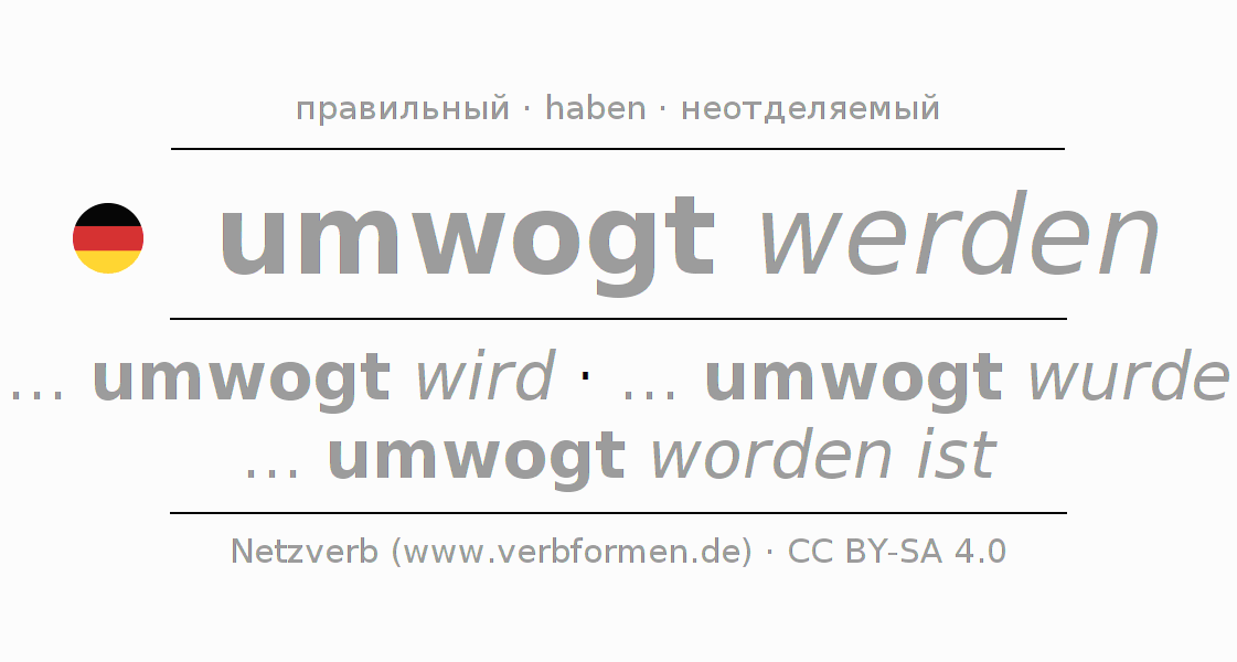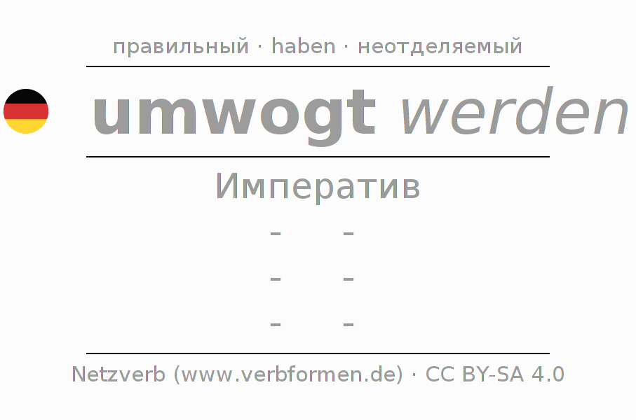 Спряжение umwogen в Императив Презенс Повелительное наклонение Пассив с werden: -, -, -, -.Образование этих форм происходит по определённым грамматическим правилам. Так же спрягаются простые глагольные формы umwogen в Императив. Kомментарии ☆