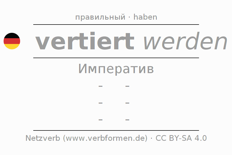 Спряжение vertieren в Императив Презенс Повелительное наклонение Пассив с werden: -, -, -, -.Образование этих форм происходит по определённым грамматическим правилам. Так же спрягаются простые глагольные формы vertieren в Императив. Kомментарии ☆