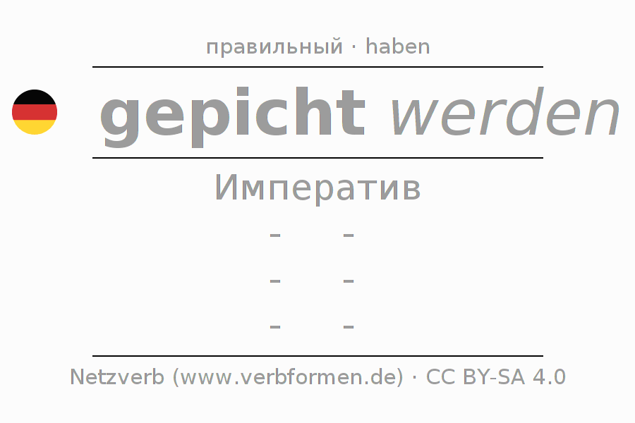 Спряжение pichen в Императив Презенс Повелительное наклонение Пассив с werden: -, -, -, -.Образование этих форм происходит по определённым грамматическим правилам. Так же спрягаются простые глагольные формы pichen в Императив. Kомментарии ☆