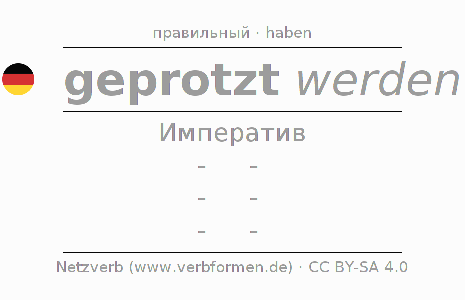 Спряжение protzen в Императив Презенс Повелительное наклонение Пассив с werden: -, -, -, -.Образование этих форм происходит по определённым грамматическим правилам. Так же спрягаются простые глагольные формы protzen в Императив. Kомментарии ☆