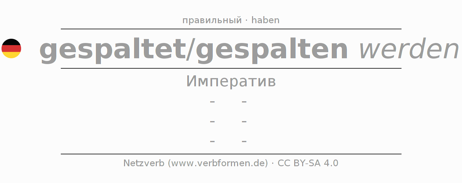 Спряжение spalten в Императив Презенс Повелительное наклонение Пассив с werden: -, -, -, -.Образование этих форм происходит по определённым грамматическим правилам. Так же спрягаются простые глагольные формы spalten в Императив. Kомментарии ☆