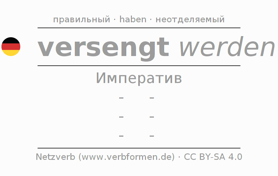 Спряжение versengen в Императив Презенс Повелительное наклонение Пассив с werden: -, -, -, -.Образование этих форм происходит по определённым грамматическим правилам. Так же спрягаются простые глагольные формы versengen в Императив. Kомментарии ☆