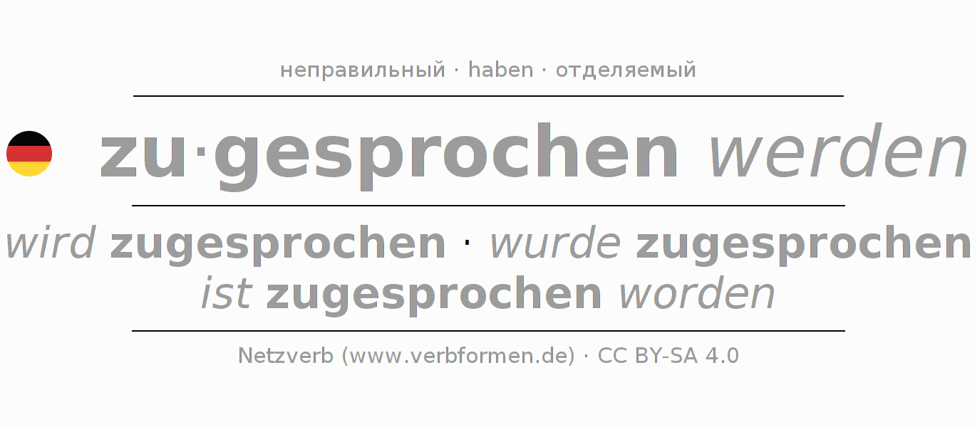 Спряжение zusprechen в Императив Презенс Повелительное наклонение Пассив с werden: -, -, -, -.Образование этих форм происходит по определённым грамматическим правилам. Так же спрягаются простые глагольные формы zusprechen в Императив. Kомментарии ☆