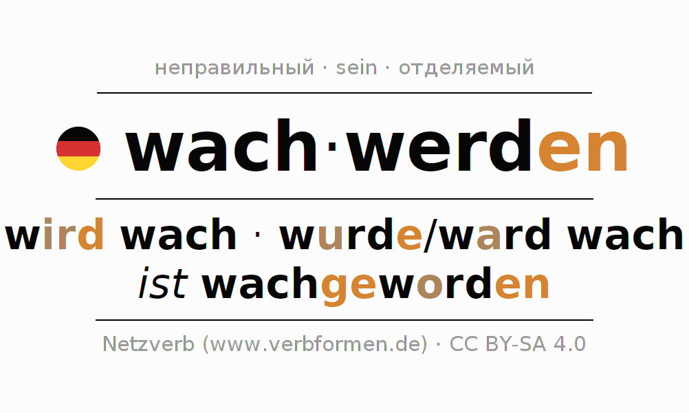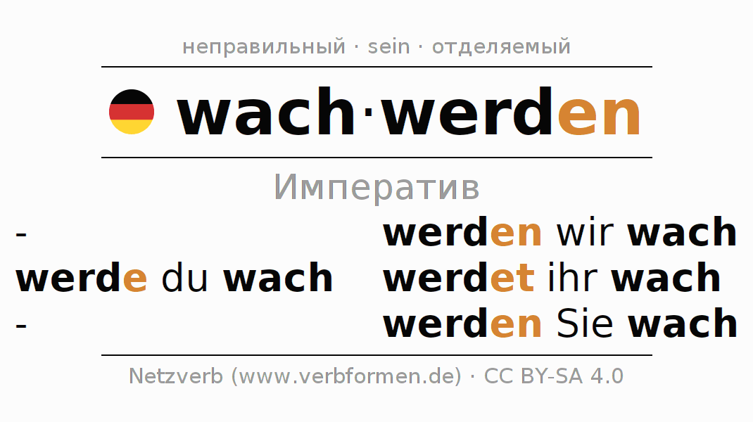 Формами спряжения wachwerden (просыпаться, очнуться) в повелительном наклонении являются: werde (du) wach, werden wir wach, werdet (ihr) wach, werden Sie wach