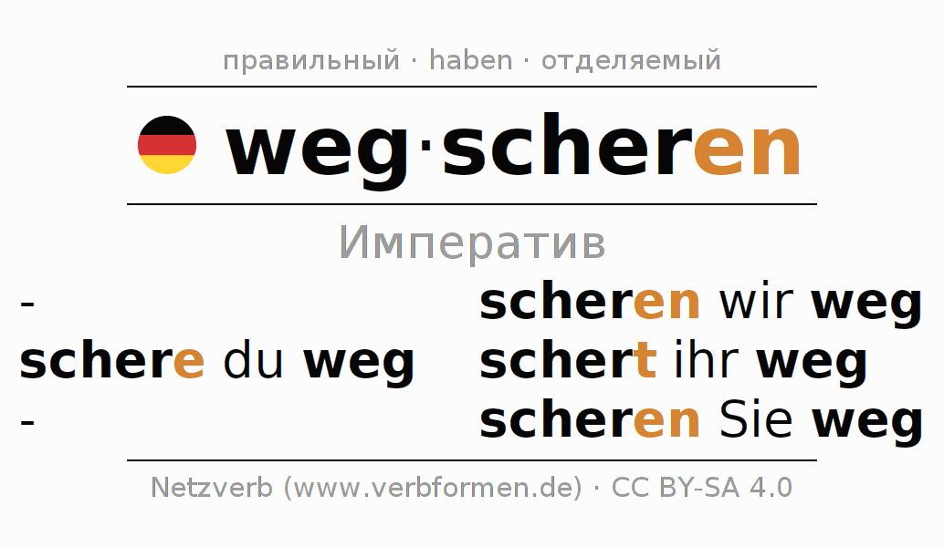Формами спряжения wegscheren (убираться, покидать) в повелительном наклонении являются: schere (du) weg, scheren wir weg, schert (ihr) weg, scheren Sie weg