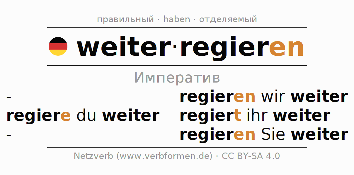 Формами спряжения weiterregieren (продолжать правление) в повелительном наклонении являются: regiere (du) weiter, regieren wir weiter, regiert (ihr) weiter, regieren Sie weiter