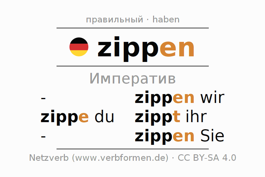 Формами спряжения zippen (сжать, сжимать) в повелительном наклонении являются: zippe (du), zippen wir, zippt (ihr), zippen Sie