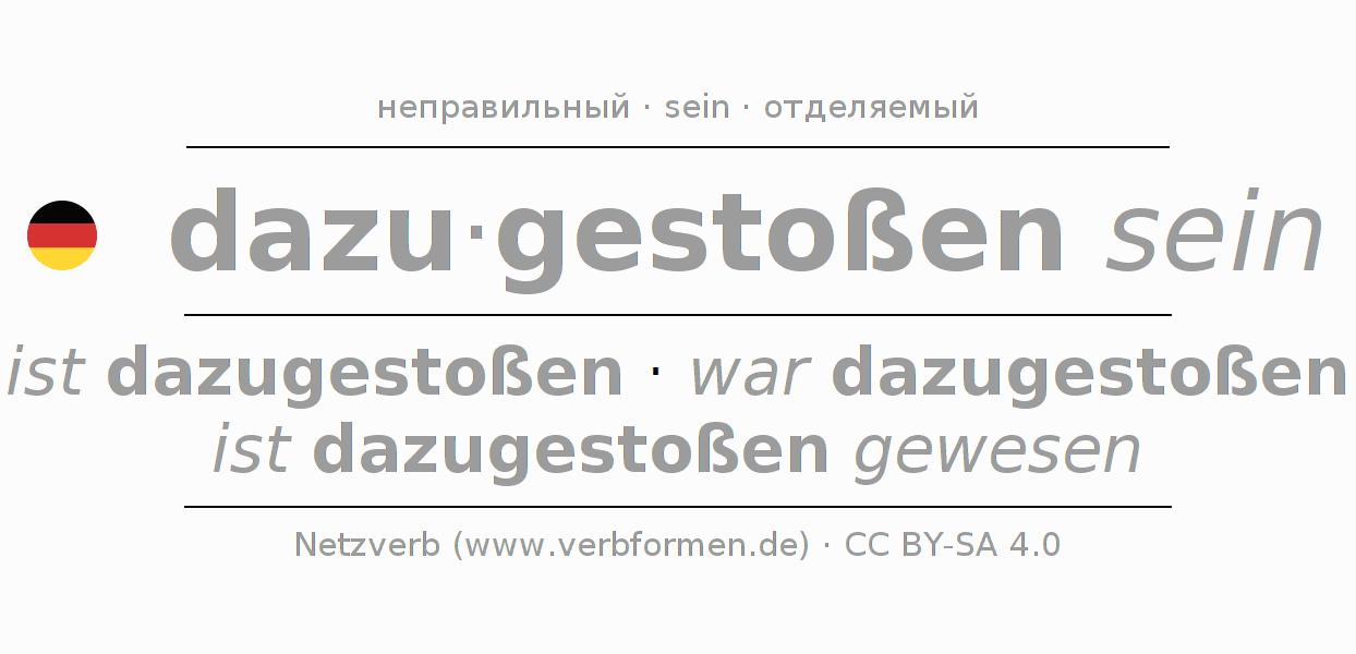 Спряжение dazustoßen в Императив Презенс Повелительное наклонение Пассив с sein: sei (du) dazugestoßen, seien wir dazugestoßen, seid (ihr) dazugestoßen, seien Sie dazugestoßen.Образование этих форм происходит по определённым грамматическим правилам. Так же спрягаются простые глагольные формы dazustoßen в Императив. Kомментарии ☆