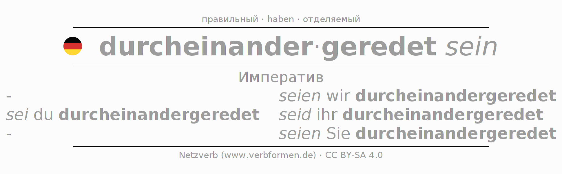 Спряжение durcheinanderreden в Императив Презенс Повелительное наклонение Пассив с sein: sei (du) durcheinandergeredet, seien wir durcheinandergeredet, seid (ihr) durcheinandergeredet, seien Sie durcheinandergeredet.Образование этих форм происходит по определённым грамматическим правилам. Так же спрягаются простые глагольные формы durcheinanderreden в Императив. Kомментарии ☆